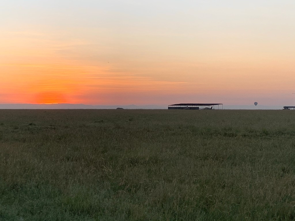 The sunrise with a hot air balloon in the distance. The structure is at the Serena air strip where I landed.