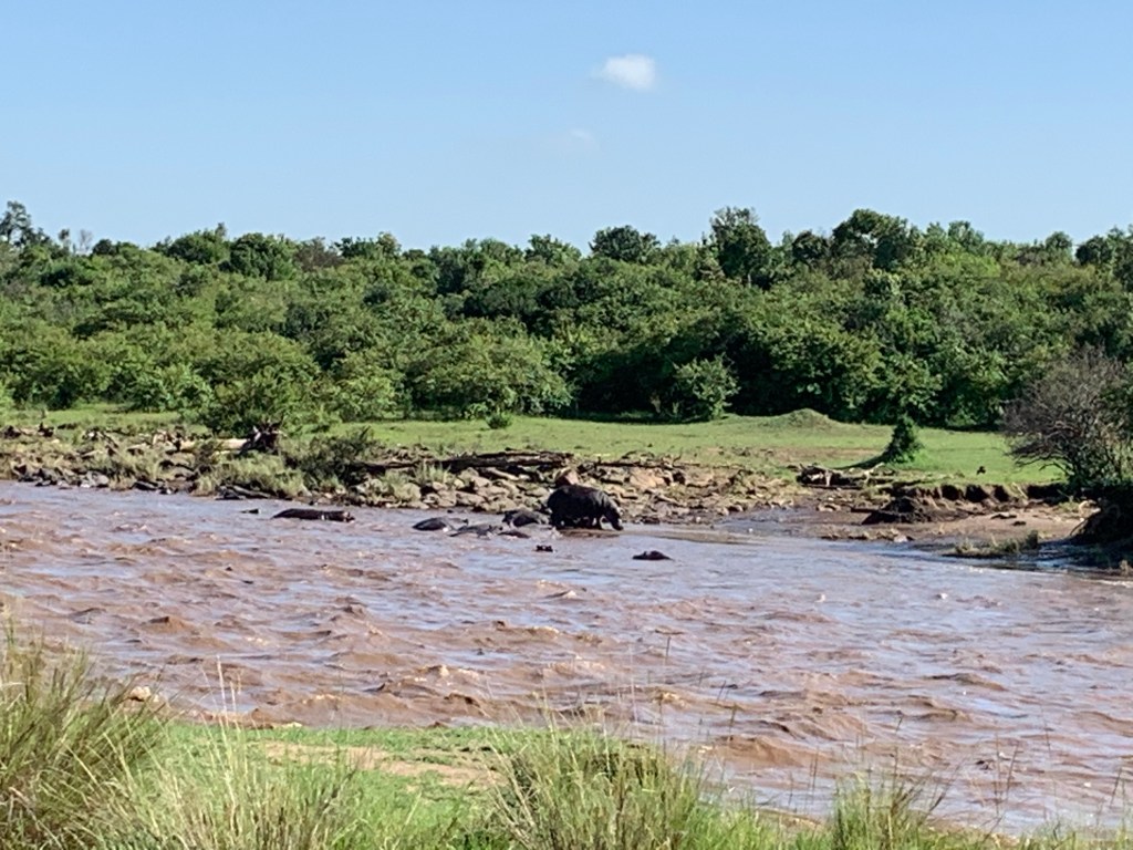 The surprise of the morning came when my driver stopped at the side of the Mara River & had me get out of the car. I was met by another team member and escorted to breakfast by the river!! There were about 20 of us in the end that gathered here for breakfast. This area of the river is known as the hippo pool & there were several hippos in the water in the area of the river by my table. I was told by the armed conservationist that the current was too strong right now for those hippos to cross to our side of the river. That was a comfort to know, since the hippos are considered the most dangerous animal in this area. It was so amazing to have breakfast in this most beautiful place!! It is definitely one of the gems of this trip so far!!