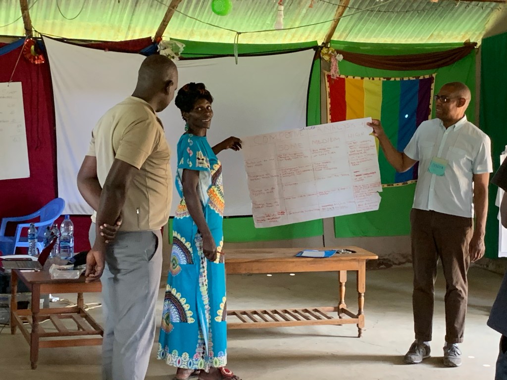 As a result of the water issue, we were an hour late in starting our lessons today. That caused a change in what we would cover, which led to a bit of confusion for the team as we began. Our class spent the morning working in groups to complete charts identifying elements about their competition & the effects those elements have on their customers. It was such a joy to experience the way they worked together & came up with many great ideas.